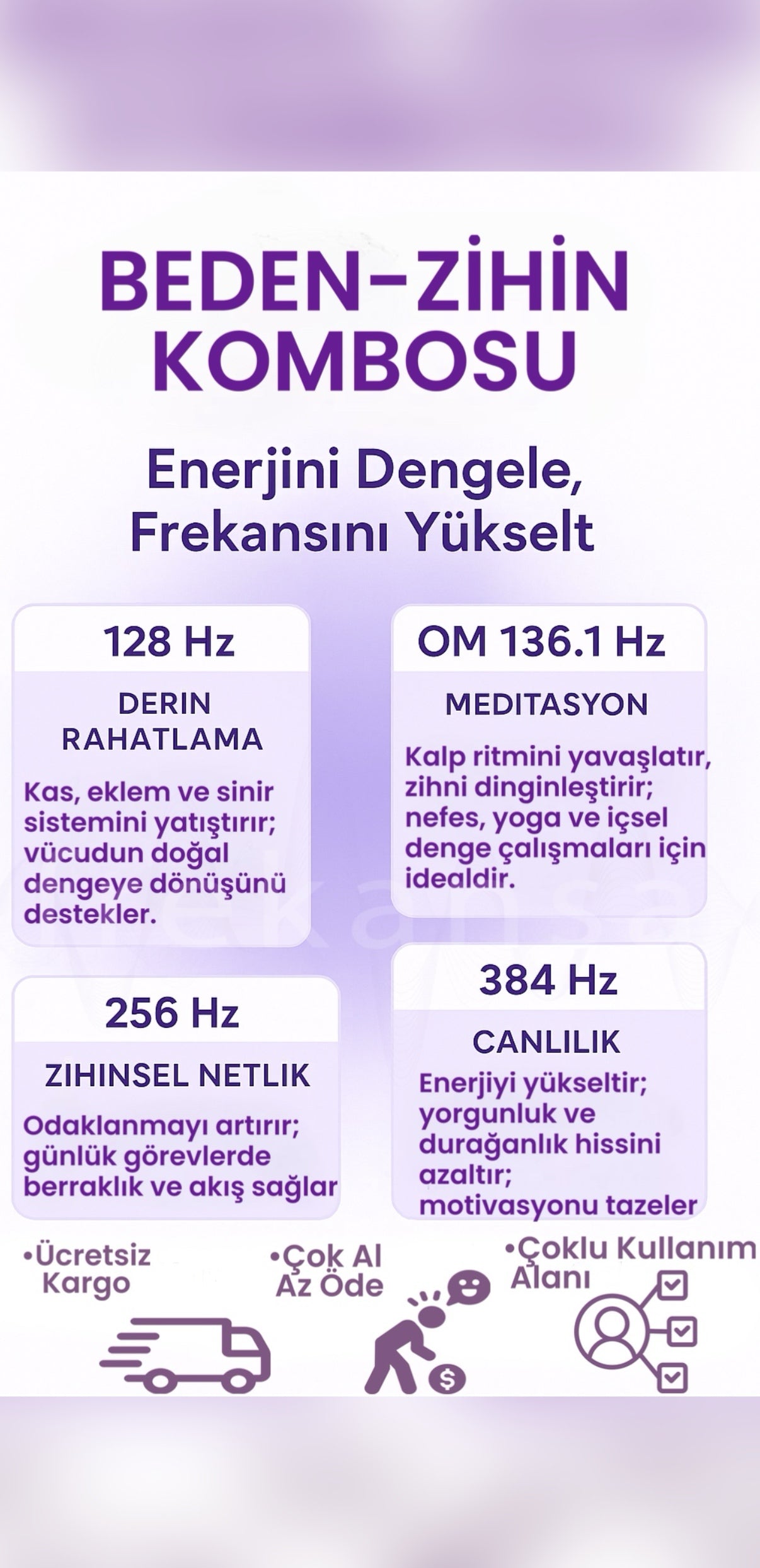 Frekansa’nın ağırlıklarına kauçuk başlıklı ahşap tokmak ile vurun, ağrı noktalarınıza ya da size dijital olarak ilettiğimiz kullanım kılavuzu ile belirtilen akupuntur/refleksoloji bölgelerine yerleştirin ve rahatlatıcı frekansın ve titreşimlerin kaslarınıza ve dokularınıza derinlemesine nüfuz etmesine izin verin. Bu güçlü ancak rahatlatıcı titreşimler kan akışını iyileştirir, lenf drenajını destekler ve dengeyi geri kazandırarak ağrı, şişlik ve sızılardan anında rahatlama sağlar. Düzenli kullanım, dokularınızda iyileştirici bir ortam yaratarak, yalnızca ağrıyı hafifletmekle kalmaz, aynı zamanda ağrının geri dönmesini de önler; kalıcı konfor ve hareket kabiliyetine ulaşmanıza yardımcı
